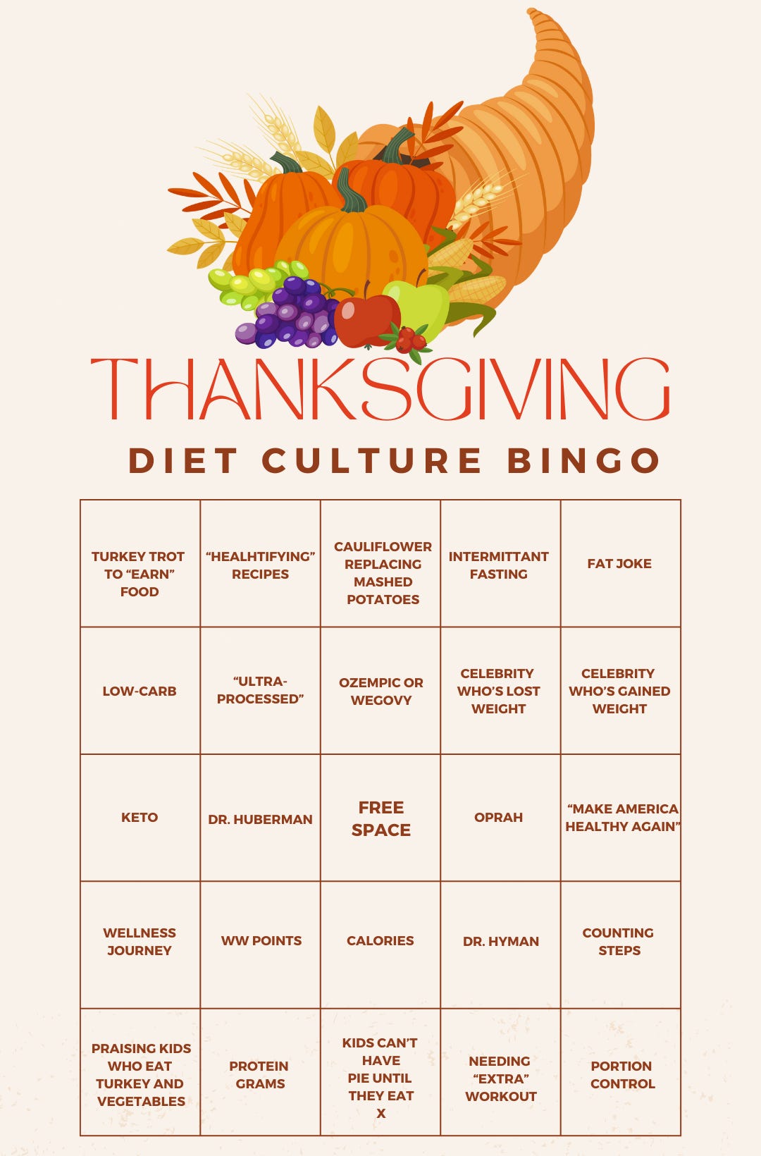 If humor’s your thing, here’s an updated version of my Diet Culture Bingo: